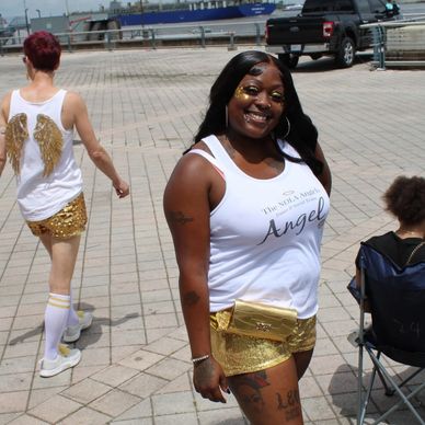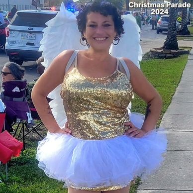 Our 'Parade Day Costume' the costume we are best known for - this is our Gold & White, full Angel Wings, costume. We wear this costume for most of our parades and some special events. Each Angel is invited to build the costume that best suites them, their body, their personality, and vision!